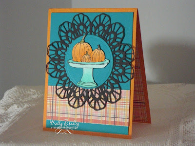 Oh, Fall is in the air on this card. Love those pumpkins and the doily is beautiful.